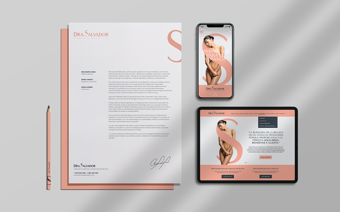 I created from scratch all the corporate identity for Doctora Salvador, a clinic located within the Corachan clinic, specialized in cosmetic surgery. I was in charge of the Corporate Manual, the logo, stationery, social networks and website.