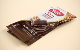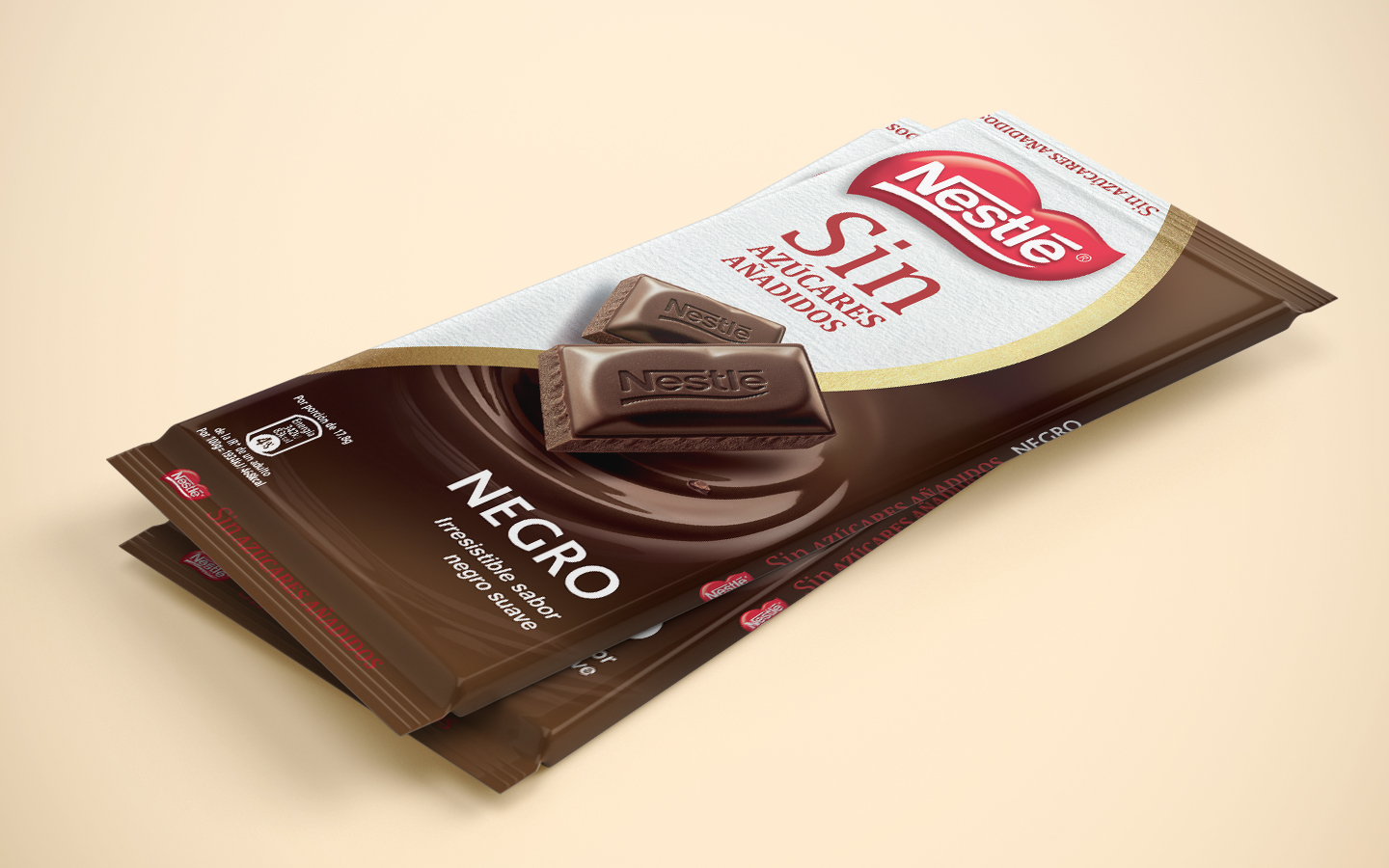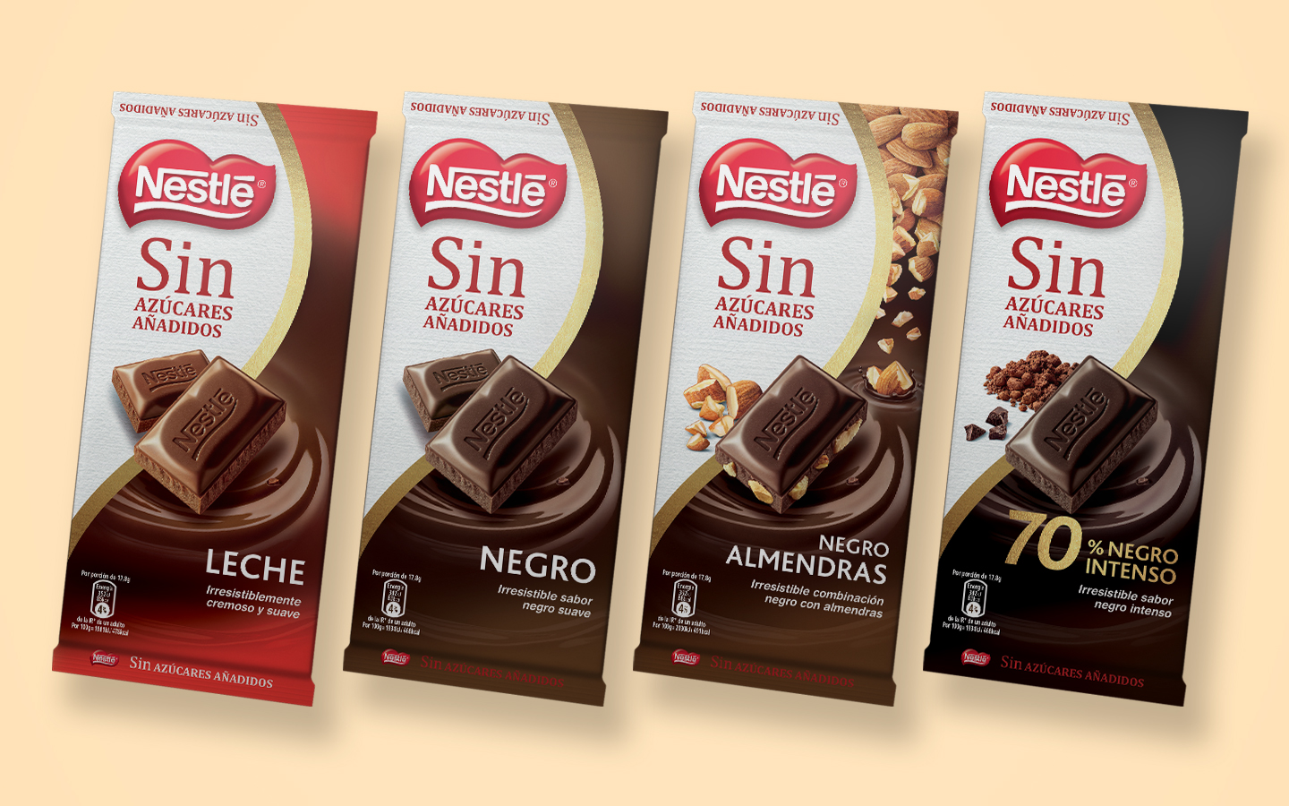 Disseny complet de la nova gamma de Nestlé sense sucres afegits, de xocolata amb llet, negre, ametlles i 70% negre intens. Tot el plaer de la xocolata però ara sense sucres afegits.