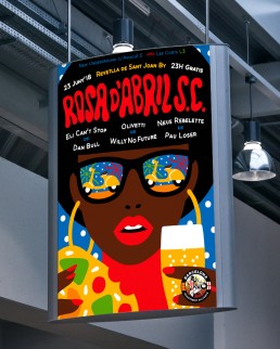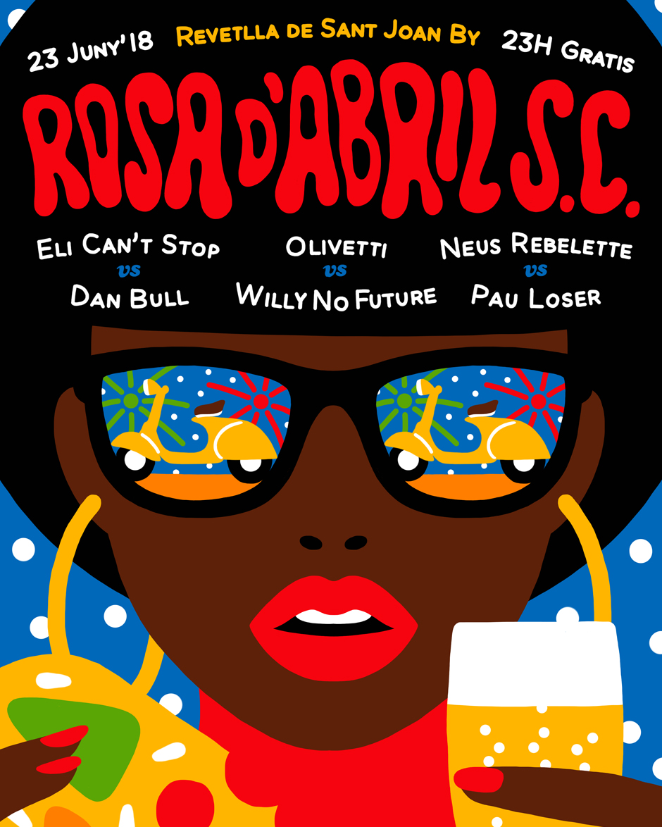 Design and illustration of the poster for Sant Joan (23rd June) of the Rosa de Abril Scooter Crew. Cava, coca and classic Scooters for a magical night accompanied by very good music.
